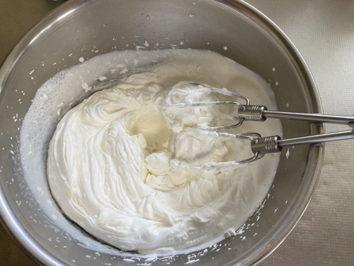 ボウルに、生クリーム、練乳、バニラベーストを入れて、電動ミキサーで泡立てます。