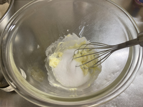 無塩バターとグラニュー糖を混ぜ、卵を数回に分けて加え その都度よく混ぜます。