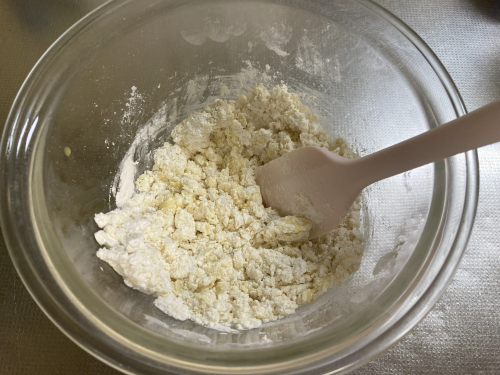 バニラオイル、薄力粉を入れて混ぜ、棒状にしたものをラップで包み、一晩冷蔵しておきます。