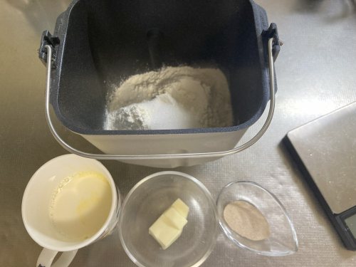 そして、当日、パン焼き機に材料を入れ、いつものように一次発酵が終わるまで待ちます。