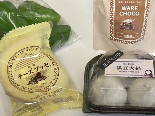 ピーマン、豆大福、チーズブッセ、チョコクランチです。