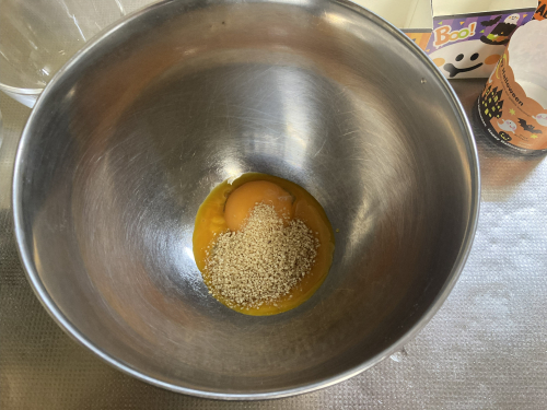 卵黄にメープルシュガーを加え、泡だて器で混ぜます。