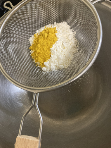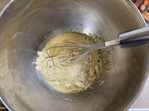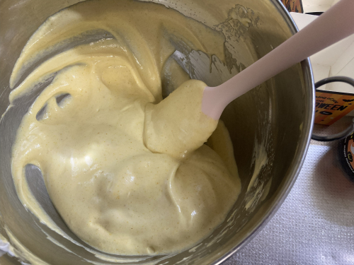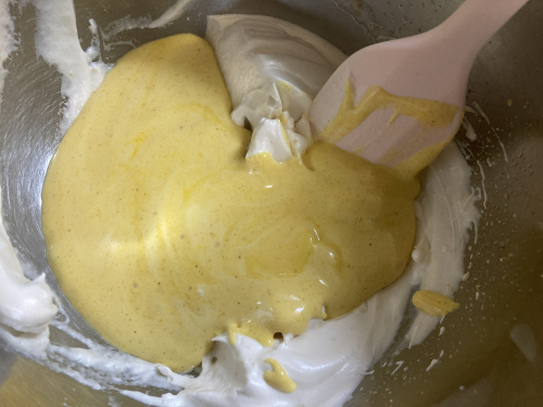メレンゲの一部を前に作った生地に加えて混ぜ、そのあと残りのメレンゲのボウルに戻し、切るように混ぜます。