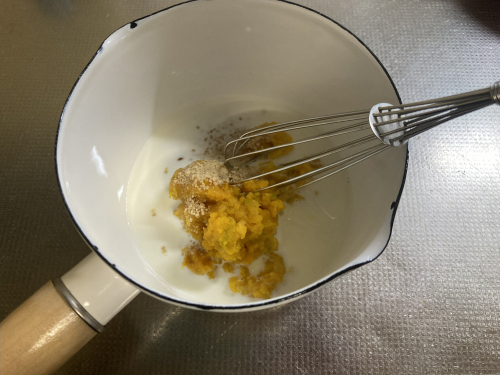 ゆでて潰したかぼちゃにメープルシュガーなどを加え、鍋で少し煮て、しっかり冷まします。