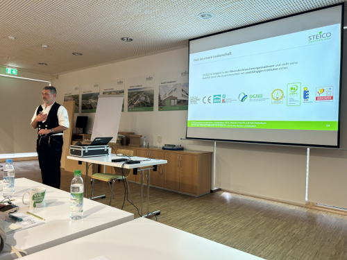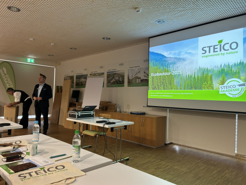 まず、座学からということで、STEICO社のMarcel氏とFalk氏から企業の変遷や取り組み、自社製品の紹介レクチャーを受けました。