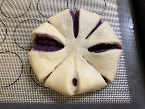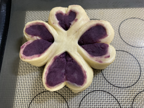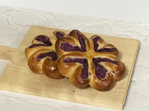 可愛らしい花型のパンで、中には、白あんと紫芋パウダーを合わせたものが入っています。
