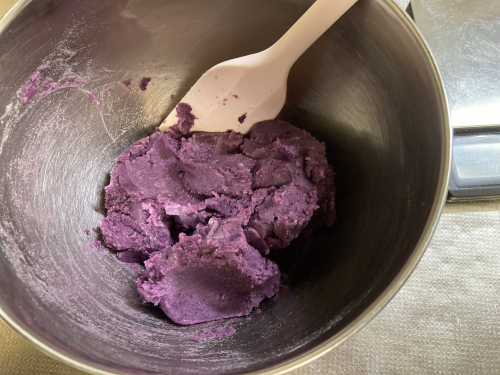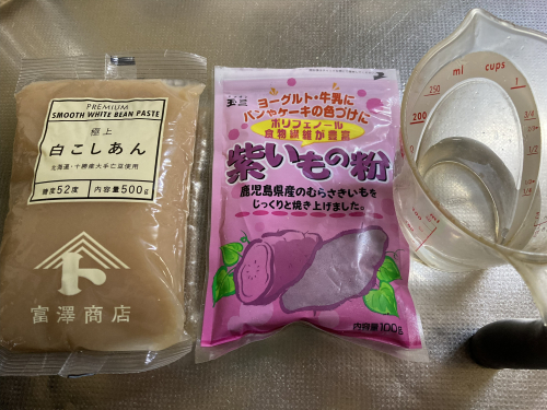 その間に、紫芋パウダーと水を合わせ、白あんを加えしっかり混ぜます。