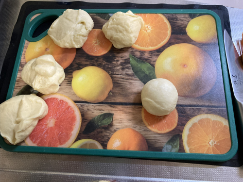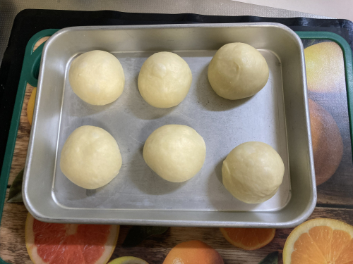 一次発酵を終えたパン生地を取り出し、等分に分割して休ませます。