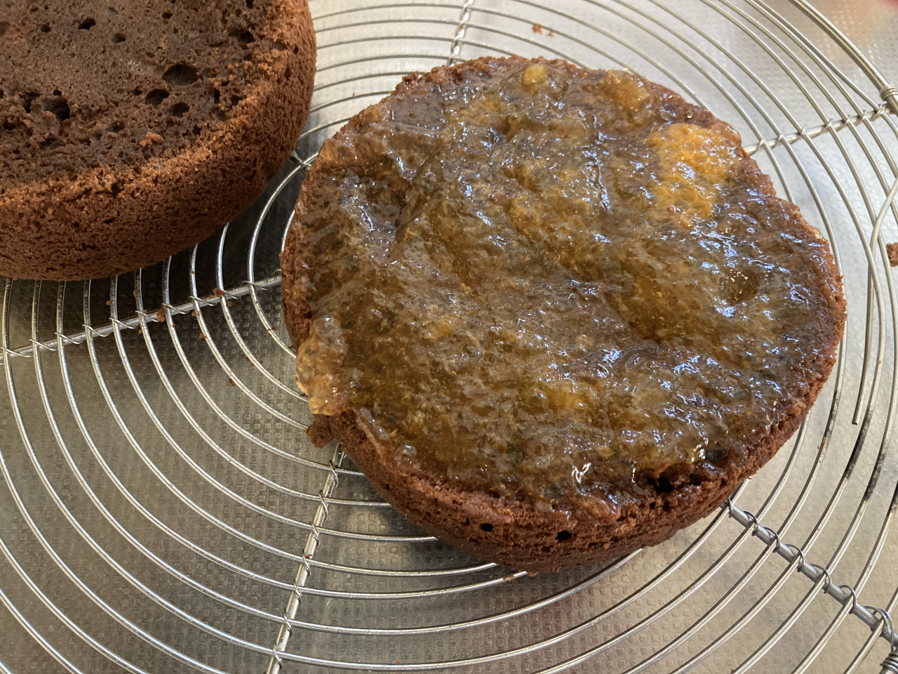 生クリームとチョコレートを温めて なめらかな状態にし、スポンジ生地に全体に行き渡るよう回しかけます。