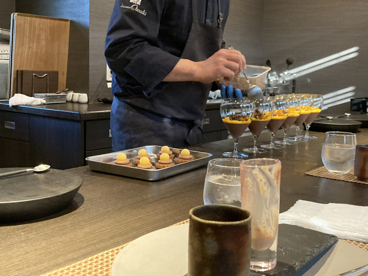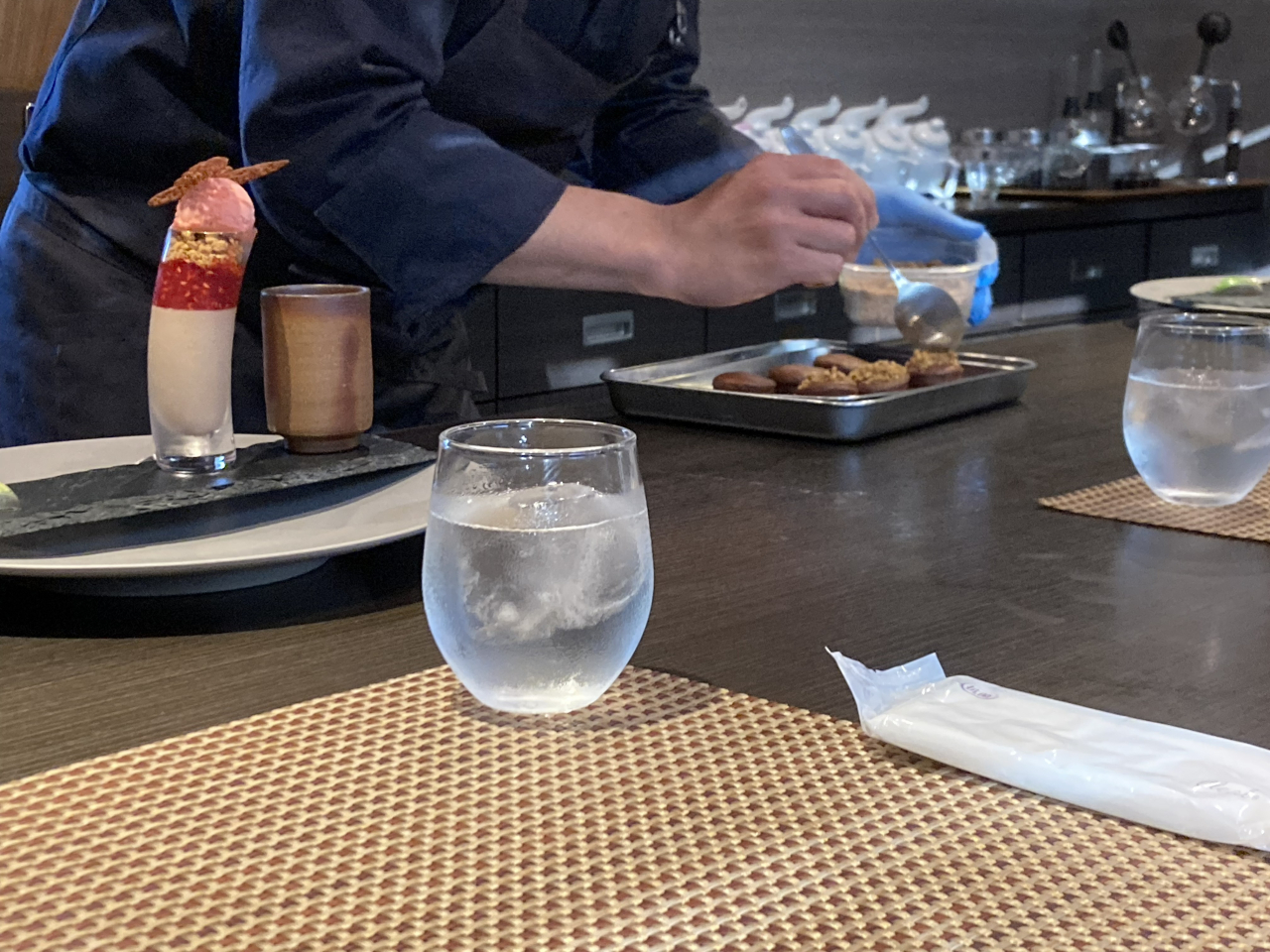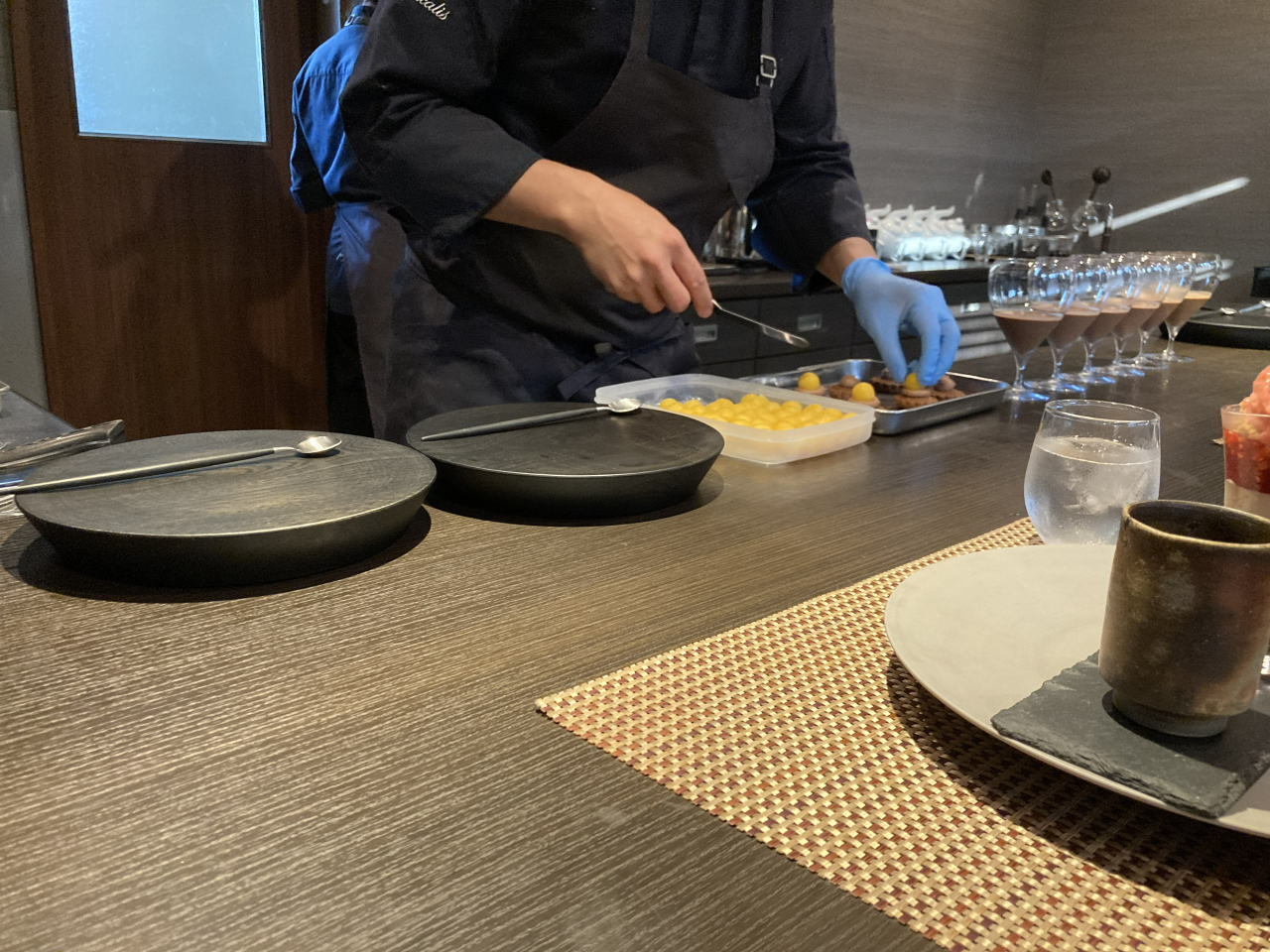 目の前で、シェフの蔭山さんがひとつずつお皿に組み立てていくライブ感を五感で楽しみながら、どんなものが出来上がるのか、大変気持ちが高ぶりました。