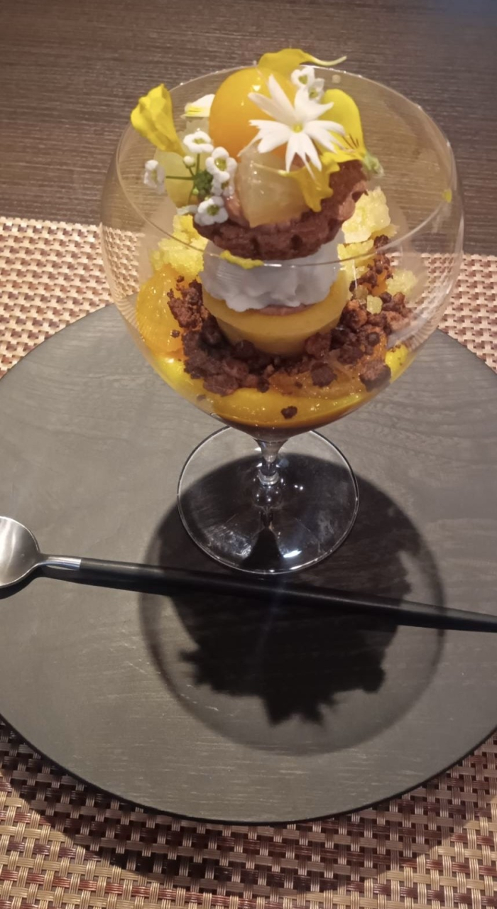 そして二皿目は、¨恋に落ちる瞬間¨と題したチョコレートと柑橘類(金柑、土佐文旦、伊予柑)のド定番だけれど、大変繊細な作業で作り出される味はとても爽やかで食べやすく、口の中が清々しく感じられる一品となりました。