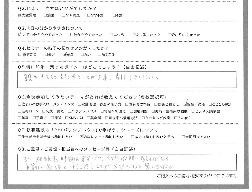 あと、これは私の反省点ですがいつもはスライド資料を配布していて、そこに皆さんがメモ書き等されていますが、今回は資料の用意をしていなかったので、アンケートと一緒にメモ用紙をお配りしておけばよかったな…と反省しています。