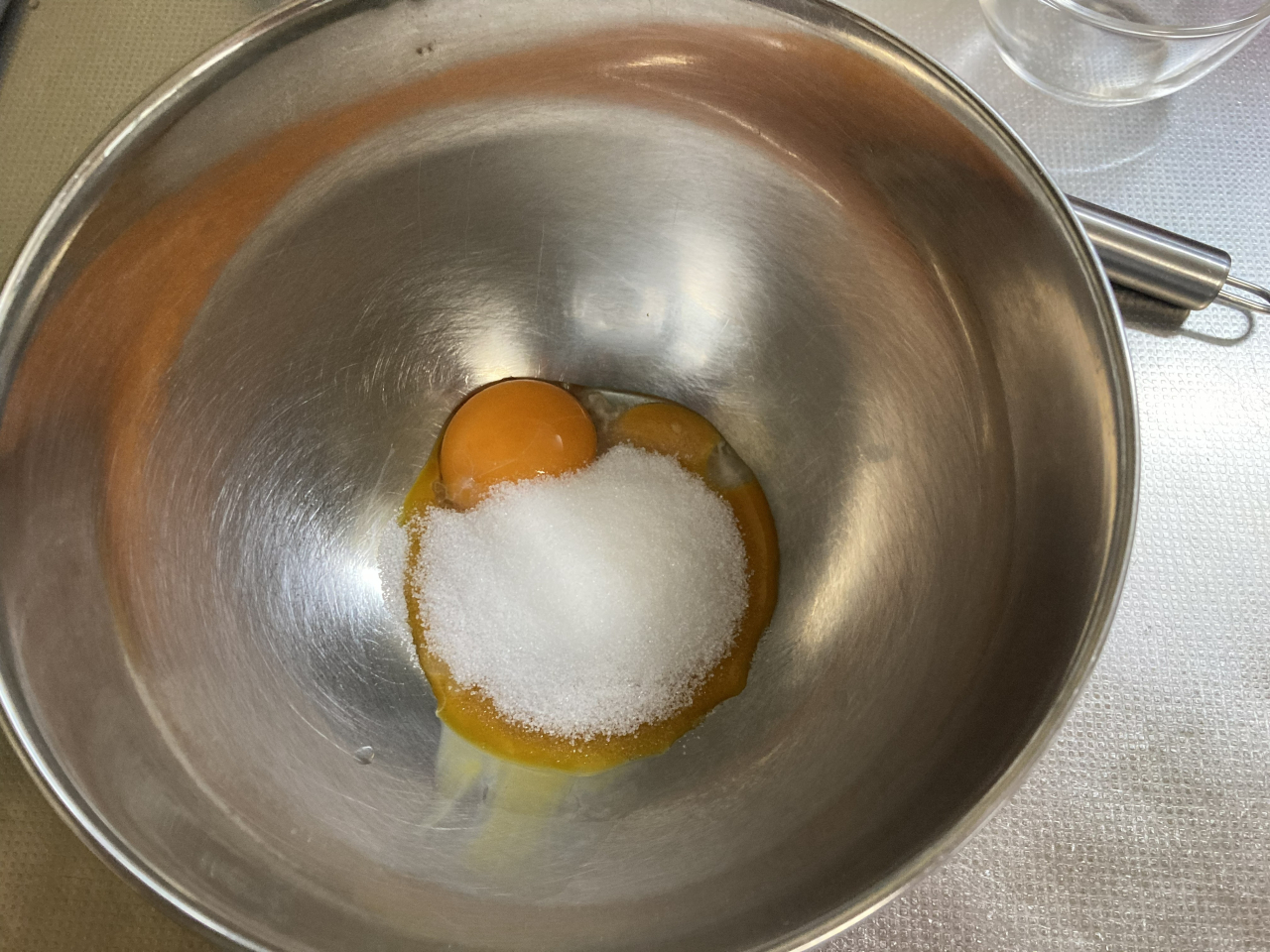 ボウルに卵黄とグラニュー糖を入れてまぜ、薄力粉も入れます。