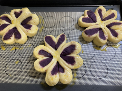 可愛らしい花型のパンで、中には、白あんと紫芋パウダーを合わせたものが入っています。