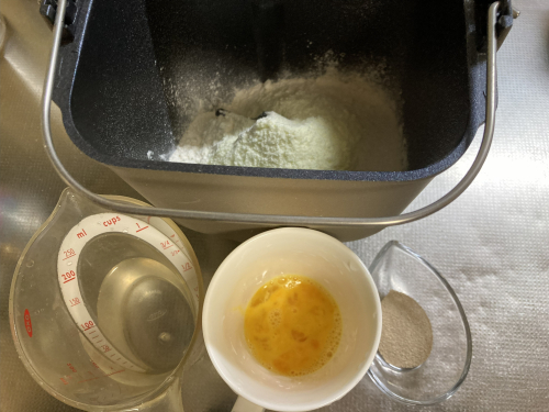 まず、パン焼き機の中に材料を入れて、一次発酵まで待ちます。