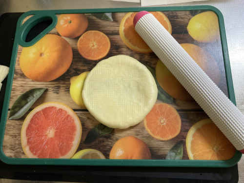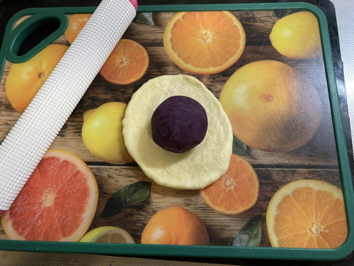生地を伸ばした後 あんを包み、直径10cmくらいになるよう押えます。