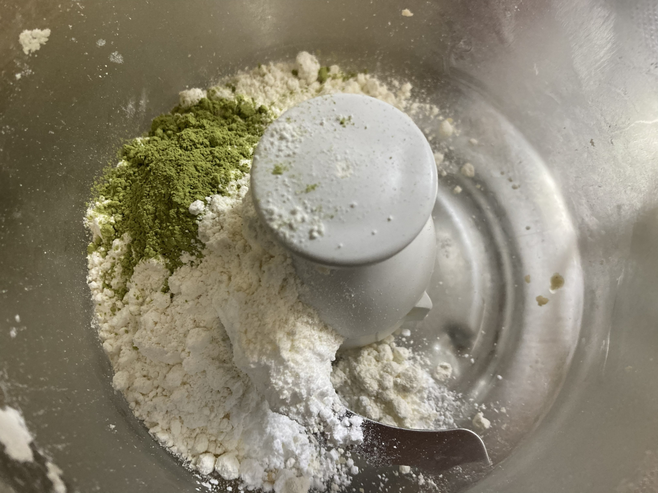 抹茶のクッキーも同様にフードプロセッサーで混ぜていき、薄く伸ばして休ませます。