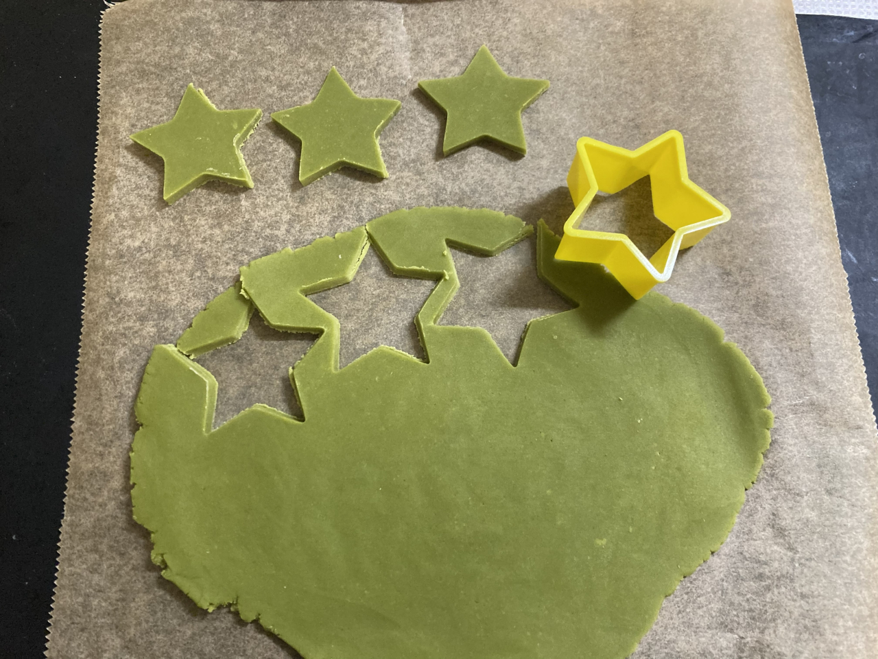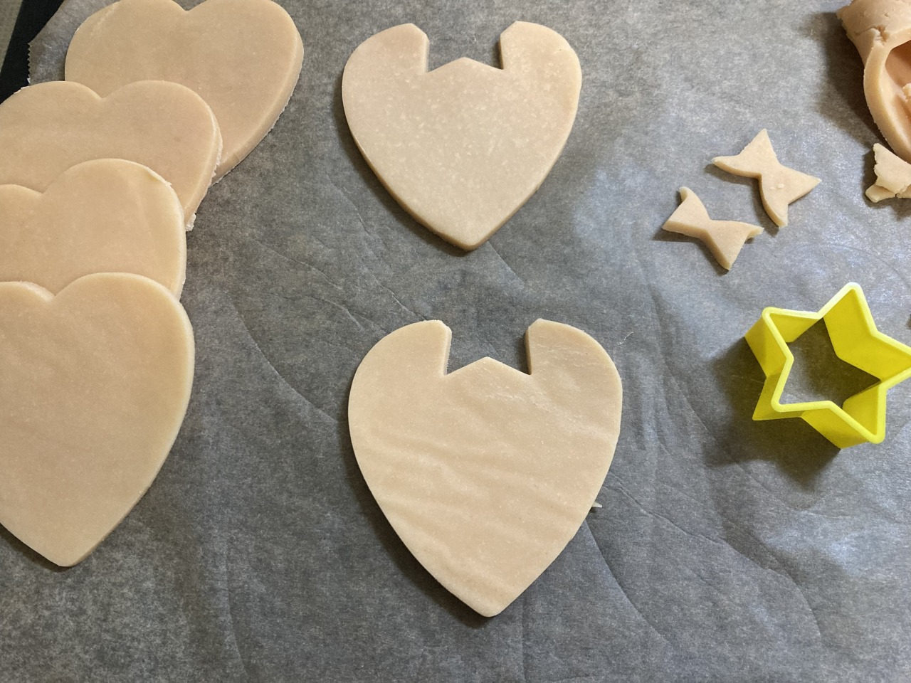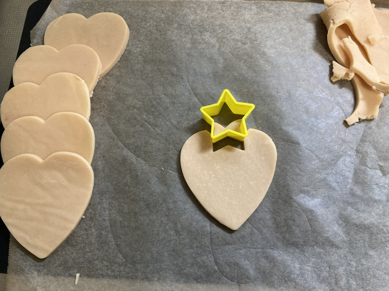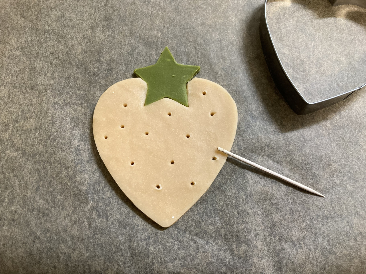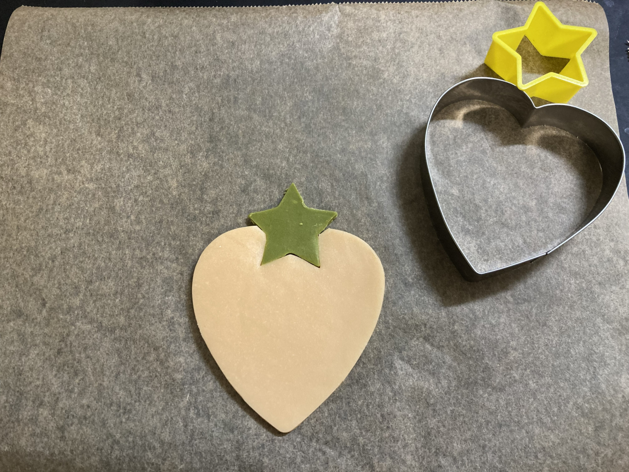抹茶クッキー生地を星型で抜き、ハートの上の部分に合わせて、軽く押して貼り付けます。