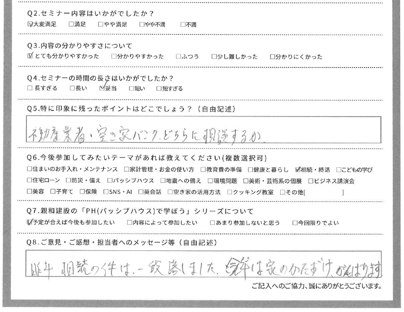 あと、これは私の反省点ですがいつもはスライド資料を配布していて、そこに皆さんがメモ書き等されていますが、今回は資料の用意をしていなかったので、アンケートと一緒にメモ用紙をお配りしておけばよかったな…と反省しています。