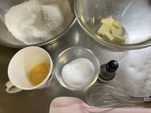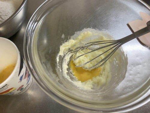 無塩バターとグラニュー糖を混ぜ、卵を数回に分けて加え その都度よく混ぜます。