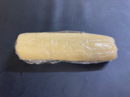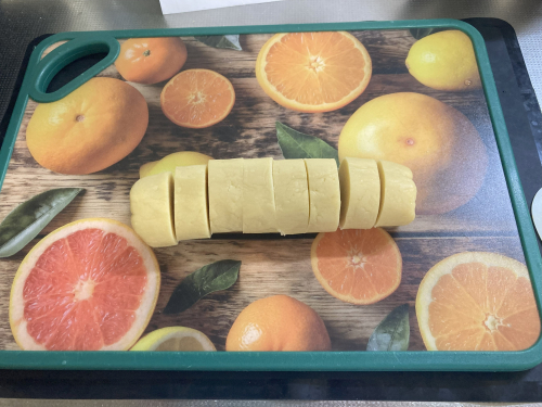 バニラオイル、薄力粉を入れて混ぜ、棒状にしたものをラップで包み、一晩冷蔵しておきます。