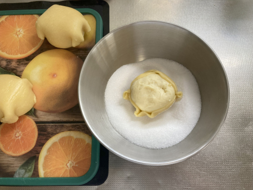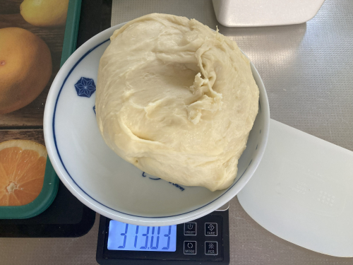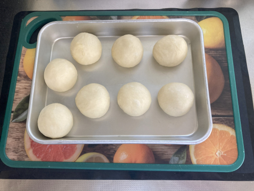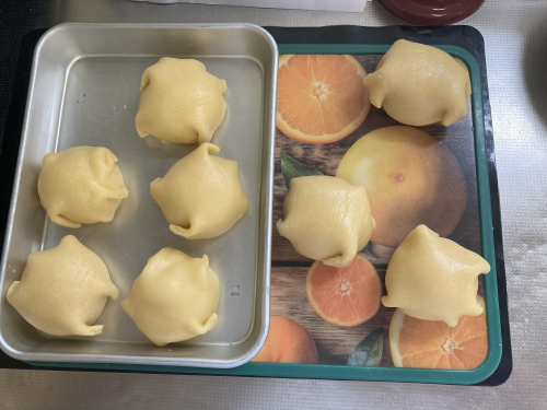 発酵後、生地を取り出し、等分にして丸め、少し休ませます。