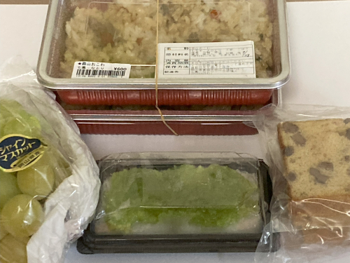 おこわ、シャインマスカット、ずんだ餅、胡桃パウンドケーキを買いました。