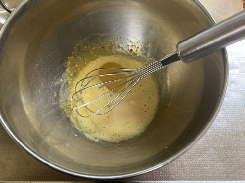 卵黄にメープルシュガーを加え、泡だて器で混ぜます。