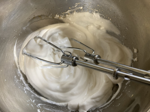 別のボウルで、卵白とメープルシュガーをハンドミキサーでしっかり泡立てます。
