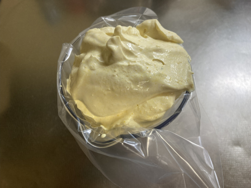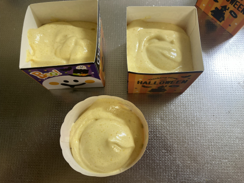 出来上がったクリームを、口金をセットした絞り袋に入れて、カップシフォンの上に渦巻き状に絞り、ハロウィンの飾り等をかざれば、出来上がりです。