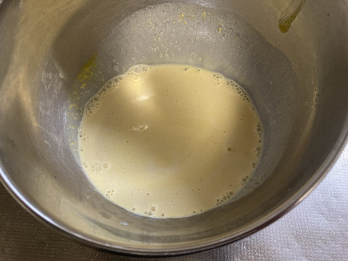 更に、牛乳、油を順に加え、その都度しっかり混ぜます。