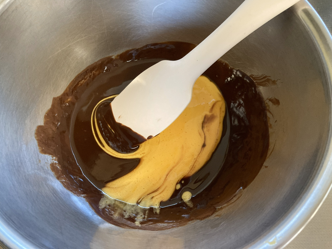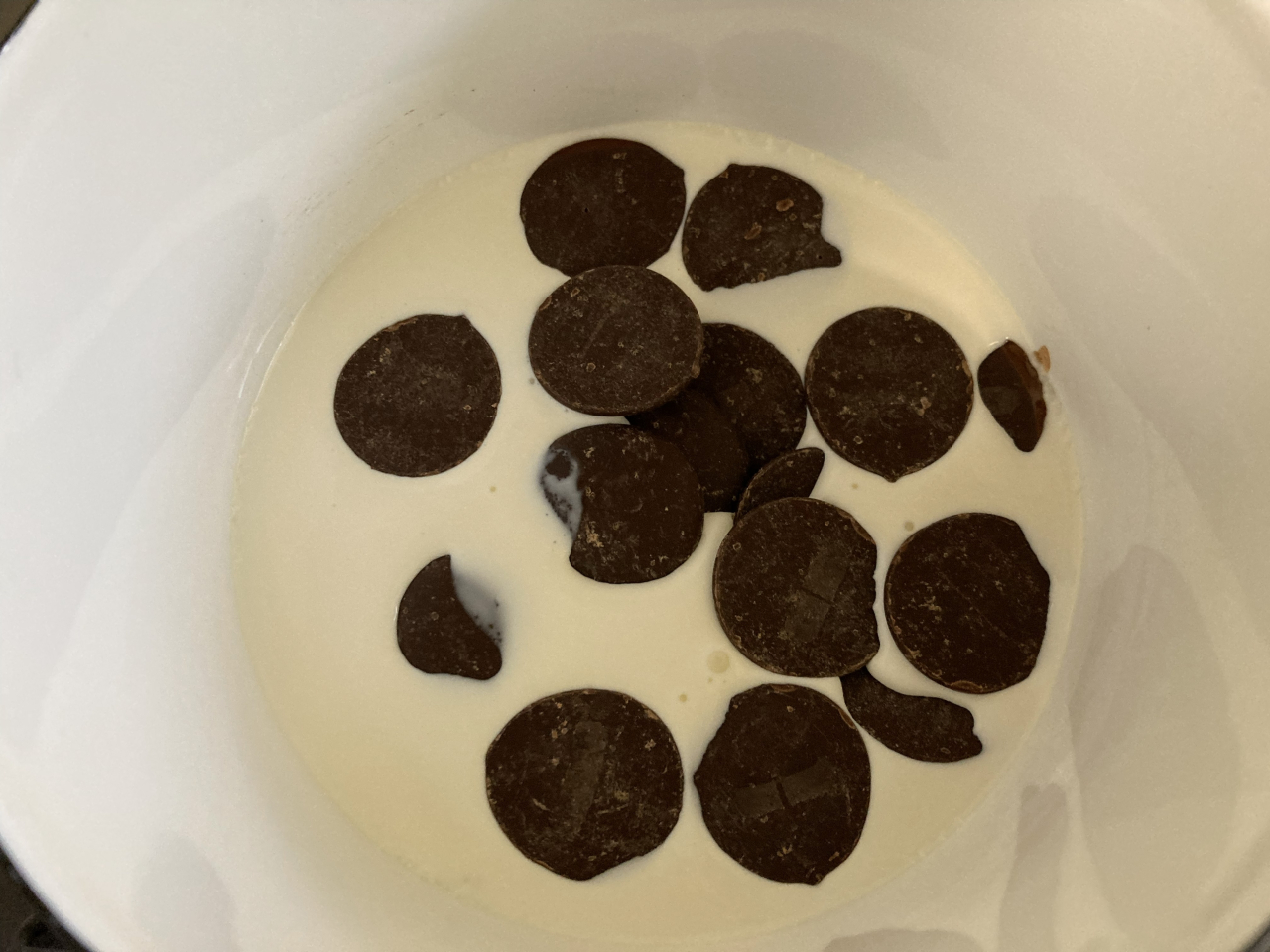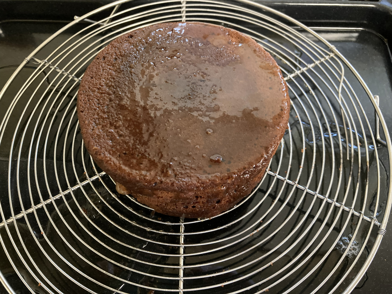生クリームとチョコレートを温めて なめらかな状態にし、スポンジ生地に全体に行き渡るよう回しかけます。