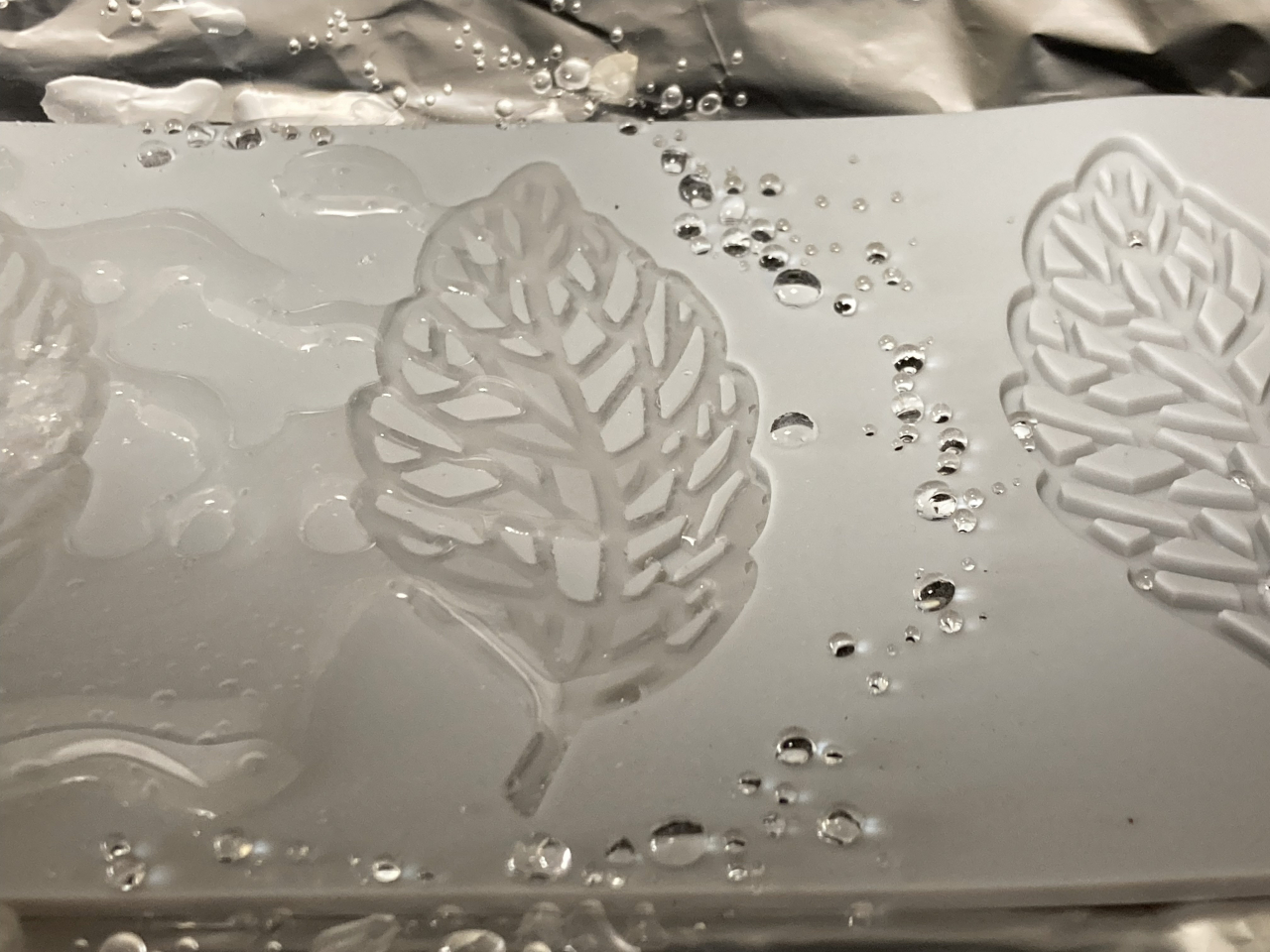 シリコン製葉っぱ型にイソマルトを敷き詰めてオーブンで焼きます。