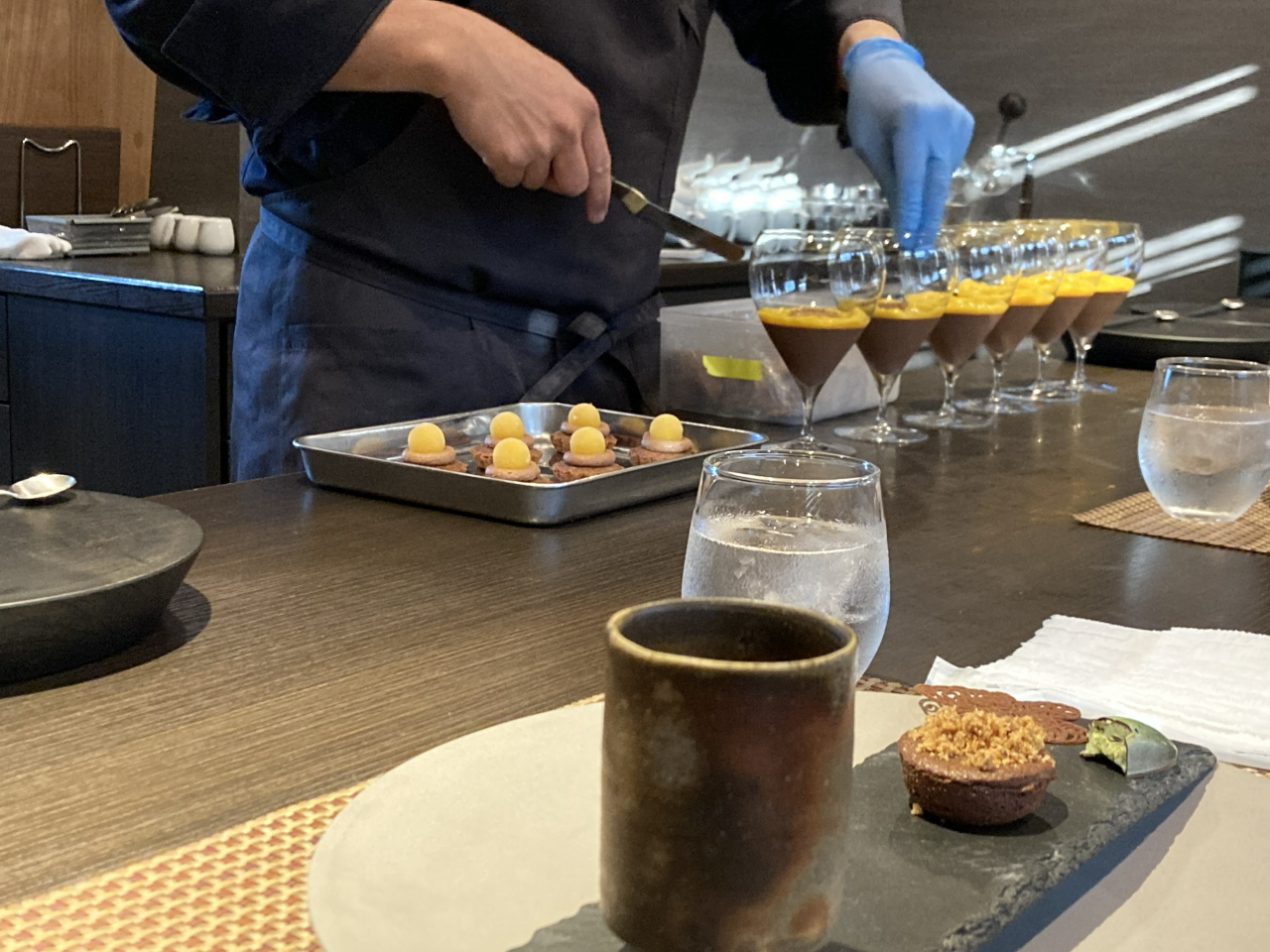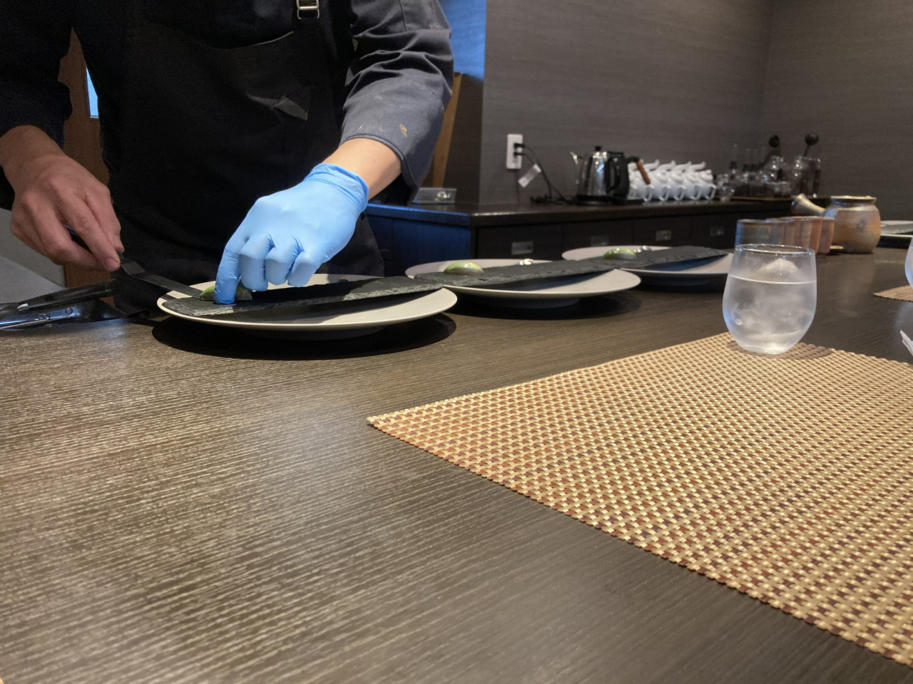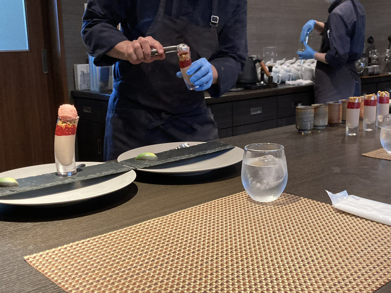 目の前で、シェフの蔭山さんがひとつずつお皿に組み立てていくライブ感を五感で楽しみながら、どんなものが出来上がるのか、大変気持ちが高ぶりました。