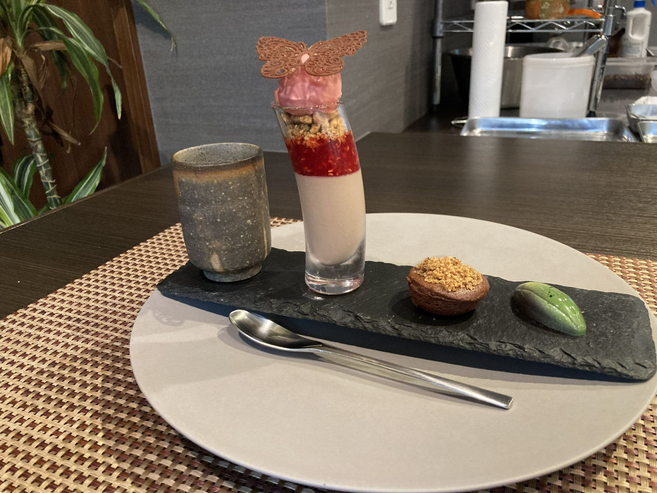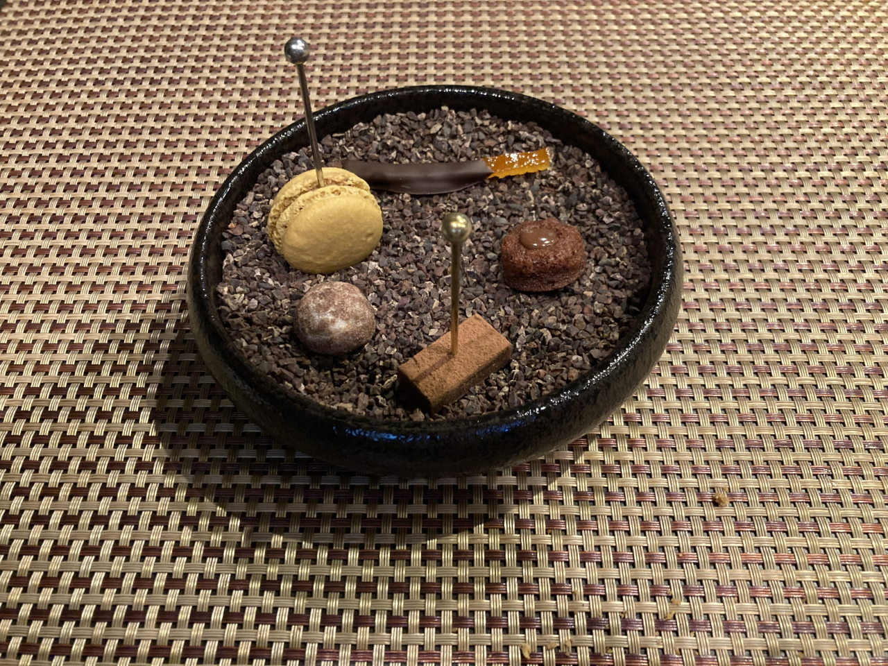 最後に、¨カカオの余韻¨と題して、マカロンや生チョコなどが置かれた小さなお皿で締めくくられました。