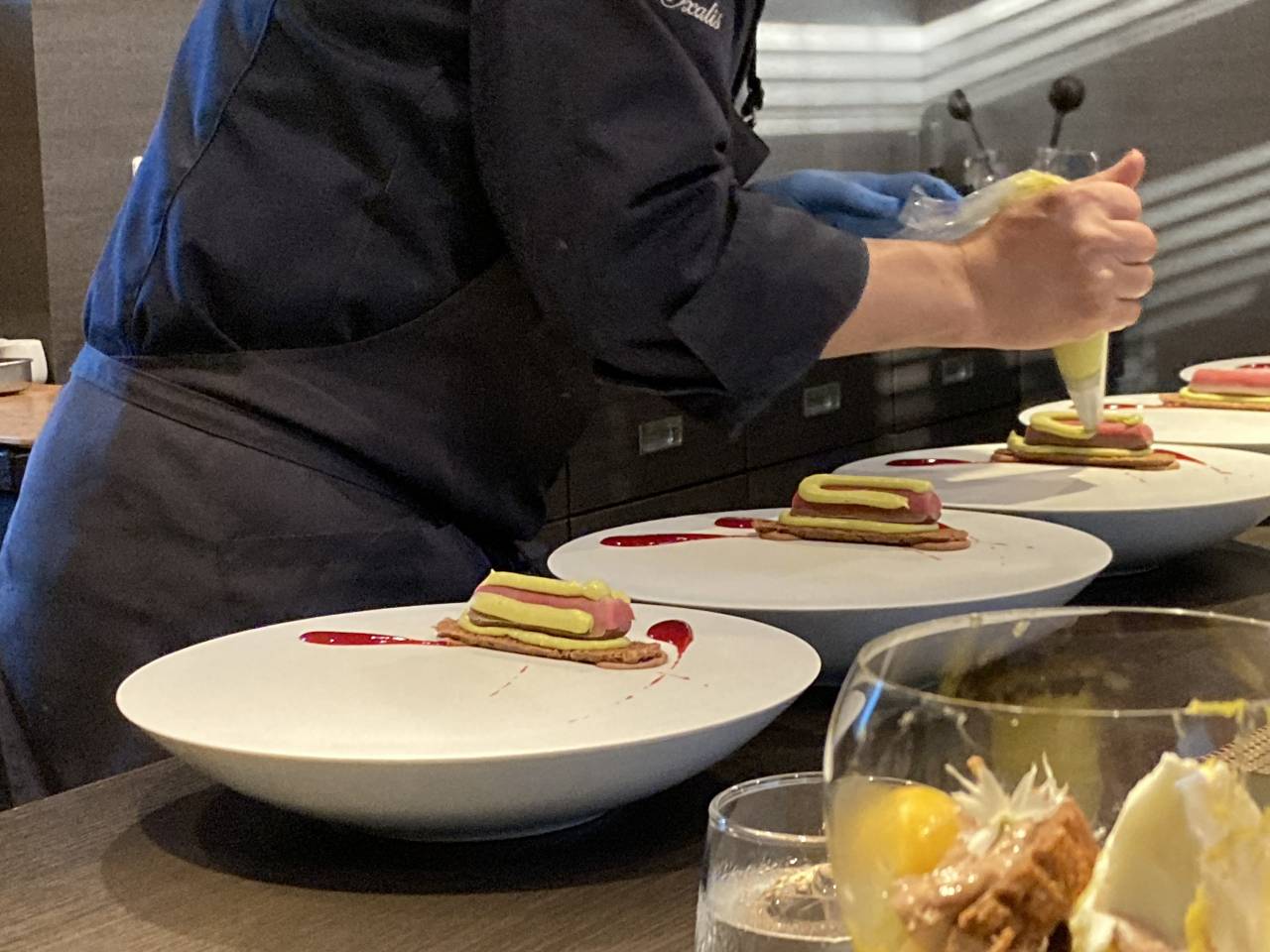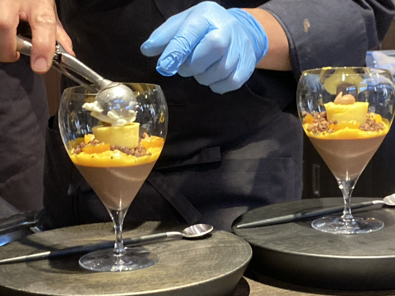 そして二皿目は、¨恋に落ちる瞬間¨と題したチョコレートと柑橘類(金柑、土佐文旦、伊予柑)のド定番だけれど、大変繊細な作業で作り出される味はとても爽やかで食べやすく、口の中が清々しく感じられる一品となりました。