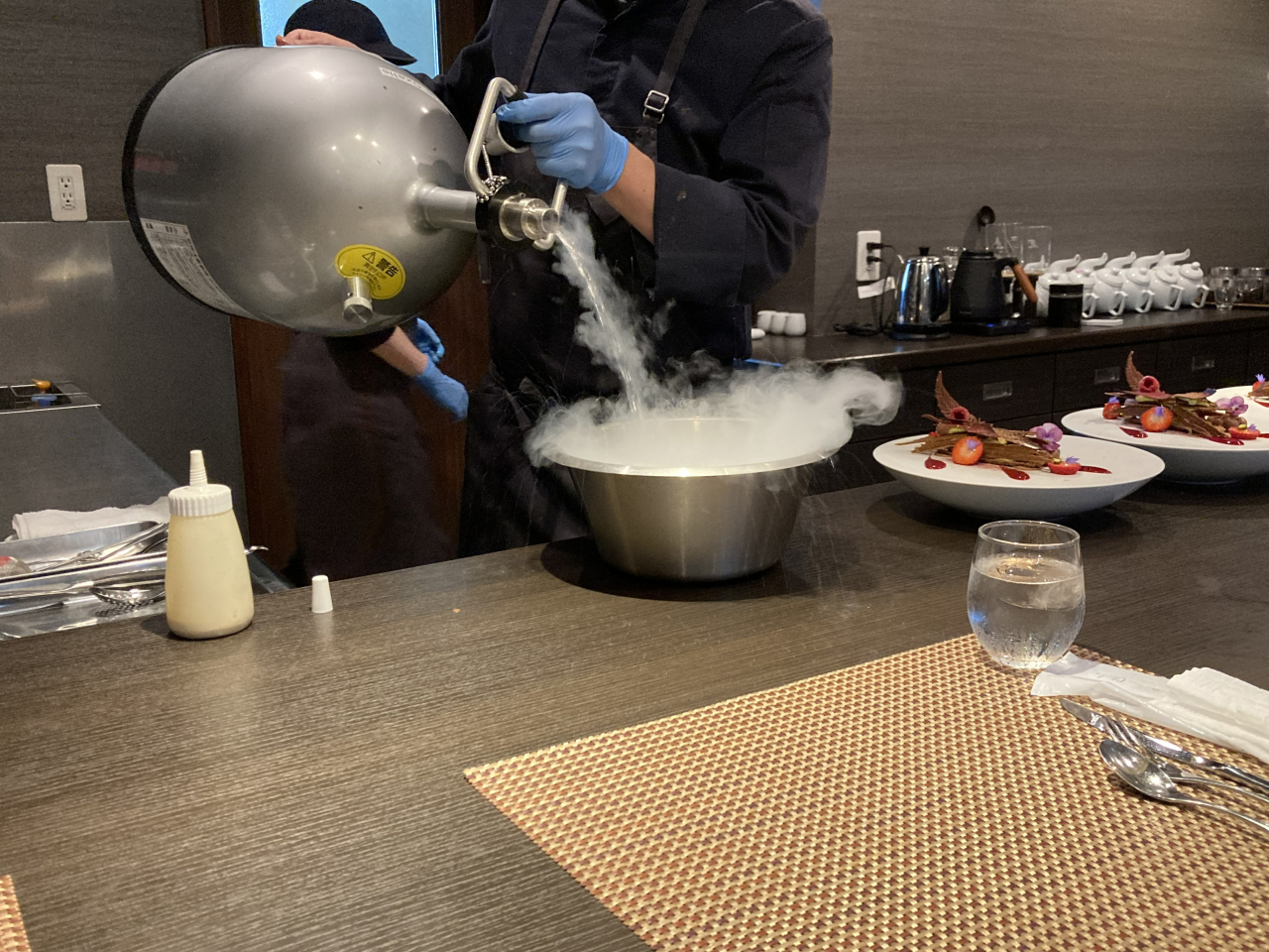 また、アイスの素と液体窒素を入れてかき混ぜ、カリカリのアイスを作っていく様子も圧巻で、原料のバターやミルクが効いてとても味わい深かったです。