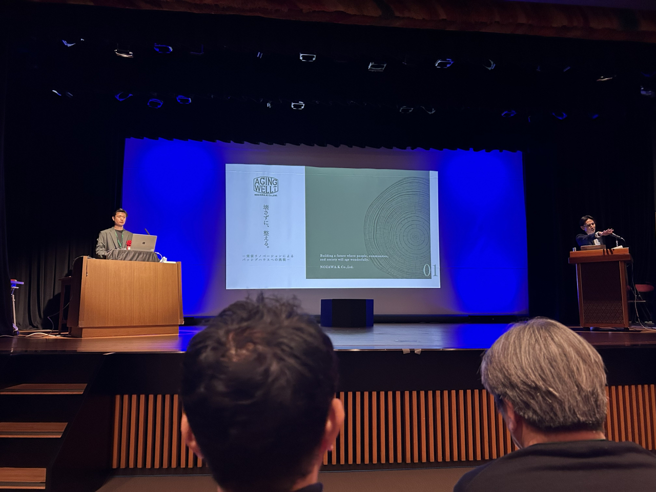 中川忠工務店の中川さんと、釿始の新校長でもある野澤工務店の野澤さんによるリノベーション事例の発表。