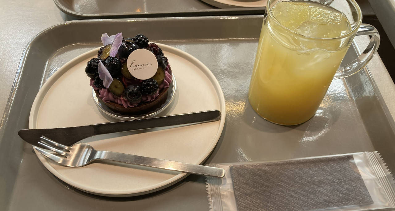 私は、ブルーベリータルトを選び、ドリンクは すりおろし林檎ジュースにしました。